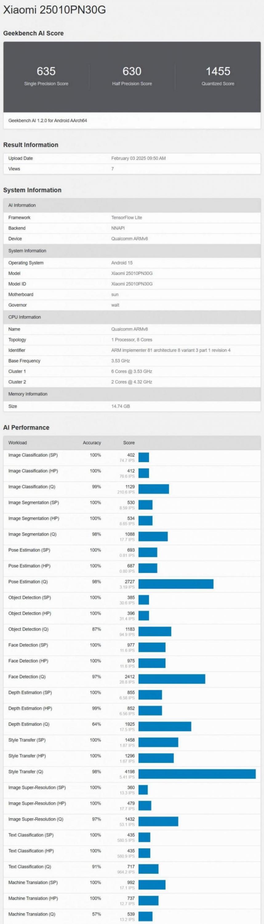 2 月 3 日,一款小米 25010PN30G 新機(jī)出現(xiàn)在了 Geekbench AI 跑分中,外媒 XpertPick 表示這是“小米 15 Ultra 的全球版”。該機(jī)搭載只有驍龍 8 至尊版才有的 Adreno 830 GPU。