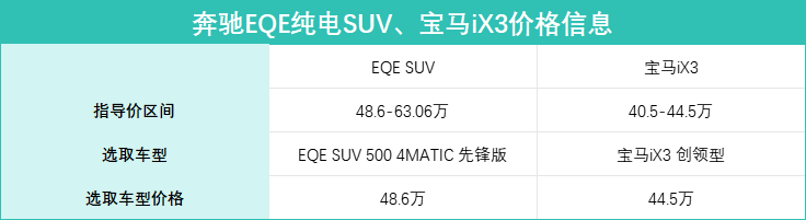 先來回顧一下兩臺車的基礎信息,EQE SUV共推出了3款車型,分別為EQE SUV 500 4MATIC 先鋒版、EQE SUV 500 4MATIC 豪華版、EQE SUV 500 4MATIC 旗艦版,三款車型的指導價分別為48.6萬、51萬、63.06萬,該車定位為中大型SUV;寶馬iX3共推出了2款車型,分別為領先型、創領型,二者的指導價分別為40.5萬、44.5萬,該車定位為中型SUV。整體來看,EQE SUV和寶馬iX3雖然定位有差異,但價格還是蠻接近,大家可能也會在兩款車型之間糾結。