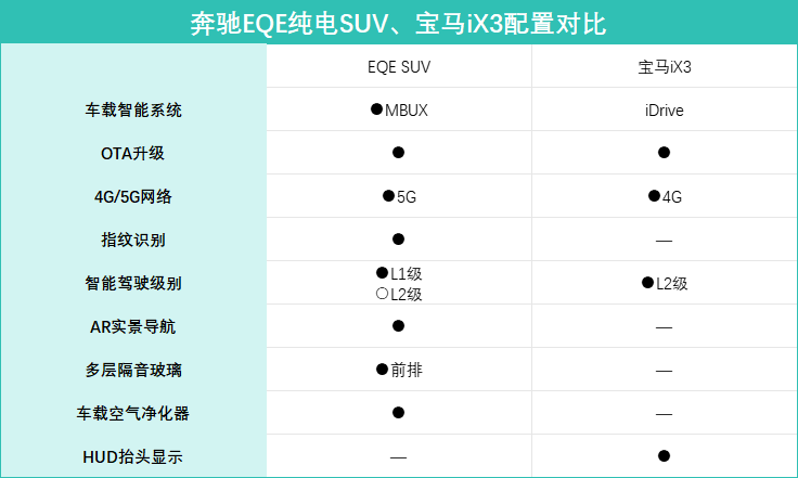 其次,智能駕駛方面,EQE SUV標配了L1級智駕系統,可實現全速自適應巡航功能,而寶馬iX3標配了L2級智駕系統,其多出了車道保持輔助、自動變道輔助等功能。同時,EQE SUV還配備了盲點輔助功能,以及實時越野路面影像功能,寶馬iX3也配備了并線輔助功能、360°全景影像。細節配置方面,EQE SUV多出了電動方向盤調節、AR實景導航、前排隔音玻璃、數字鑰匙、車載空氣凈化器等配置,寶馬iX3則多出了循跡倒車、HUD抬頭顯示等功能。整體來看,EQE SUV和寶馬iX3的配置都很豐富,且二者的表現勢均力敵。