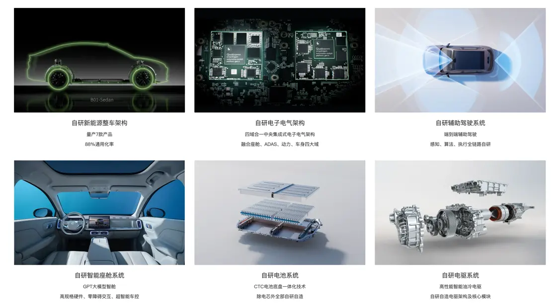 與此同時,零跑依然在不斷的用技術和模式創新壓低成本,盡可能多的實現全域自研,從而讓自己敢把更多配置越級下探。目前零跑在整車成本上已經實現了 65% 自研零部件+ 88% 平臺通用化率,將成本不斷攤薄。