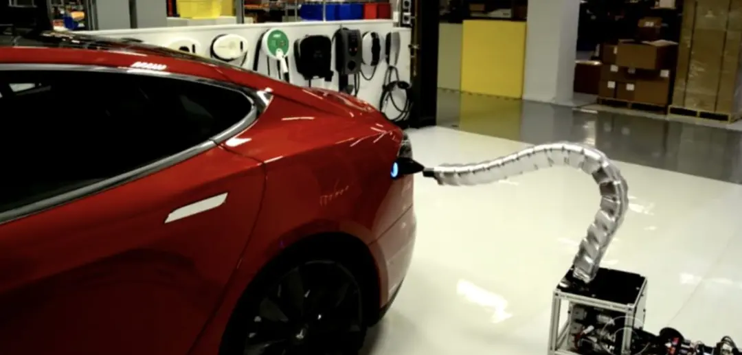 之前特斯拉的設想方案是“蛇臂充電”,像蛇形一樣的充電器可以感應到汽車充電口,然后自動插入充電。