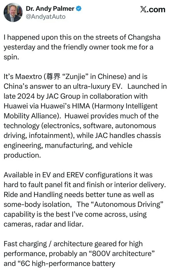 CNMO注意到,作為“汽車行業(yè)老炮”,Andy Palmer在社交平臺上對尊界S800給出了直接而具體的評價: