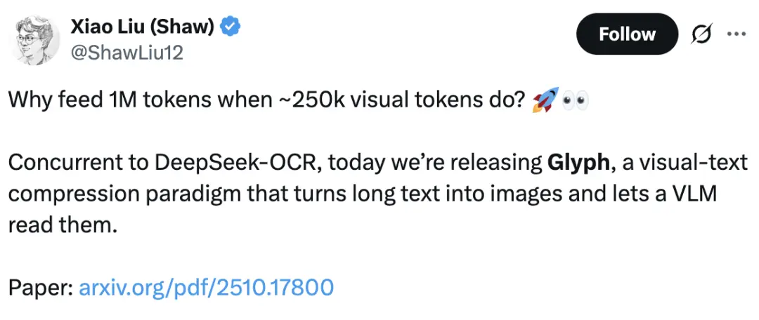 太卷了,DeepSeek-OCR剛發(fā)布不到一天,智譜就開源了自家的視覺Token方案——Glyph。