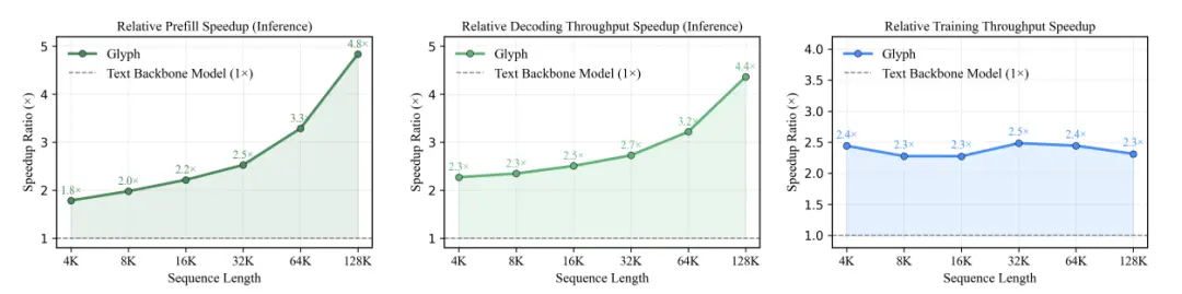 實驗結(jié)果顯示,Glyph在多項長上下文基準(zhǔn)測試中實現(xiàn)了3–4倍的Token壓縮率,同時依然保持與主流模型(如Qwen3-8B)相當(dāng)?shù)臏?zhǔn)確度。