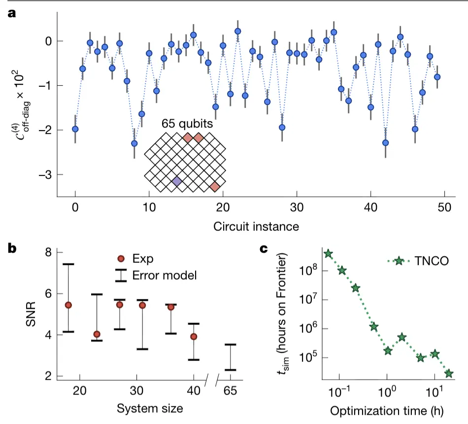 研究團(tuán)隊(duì)用超導(dǎo)量子處理器(最多用到 65 個(gè)量子比特)做了兩類(lèi)關(guān)鍵實(shí)驗(yàn),得出兩個(gè)核心結(jié)論: